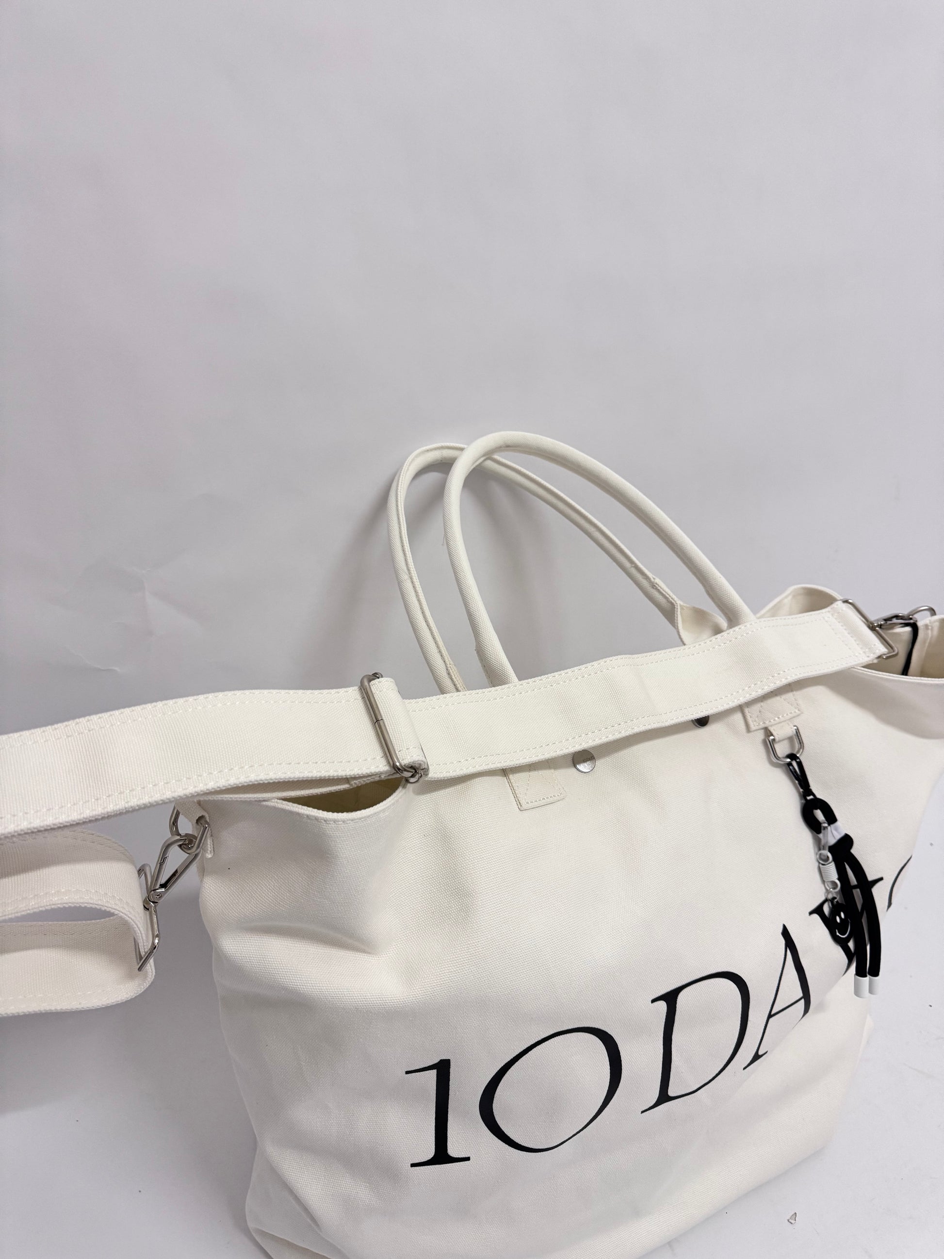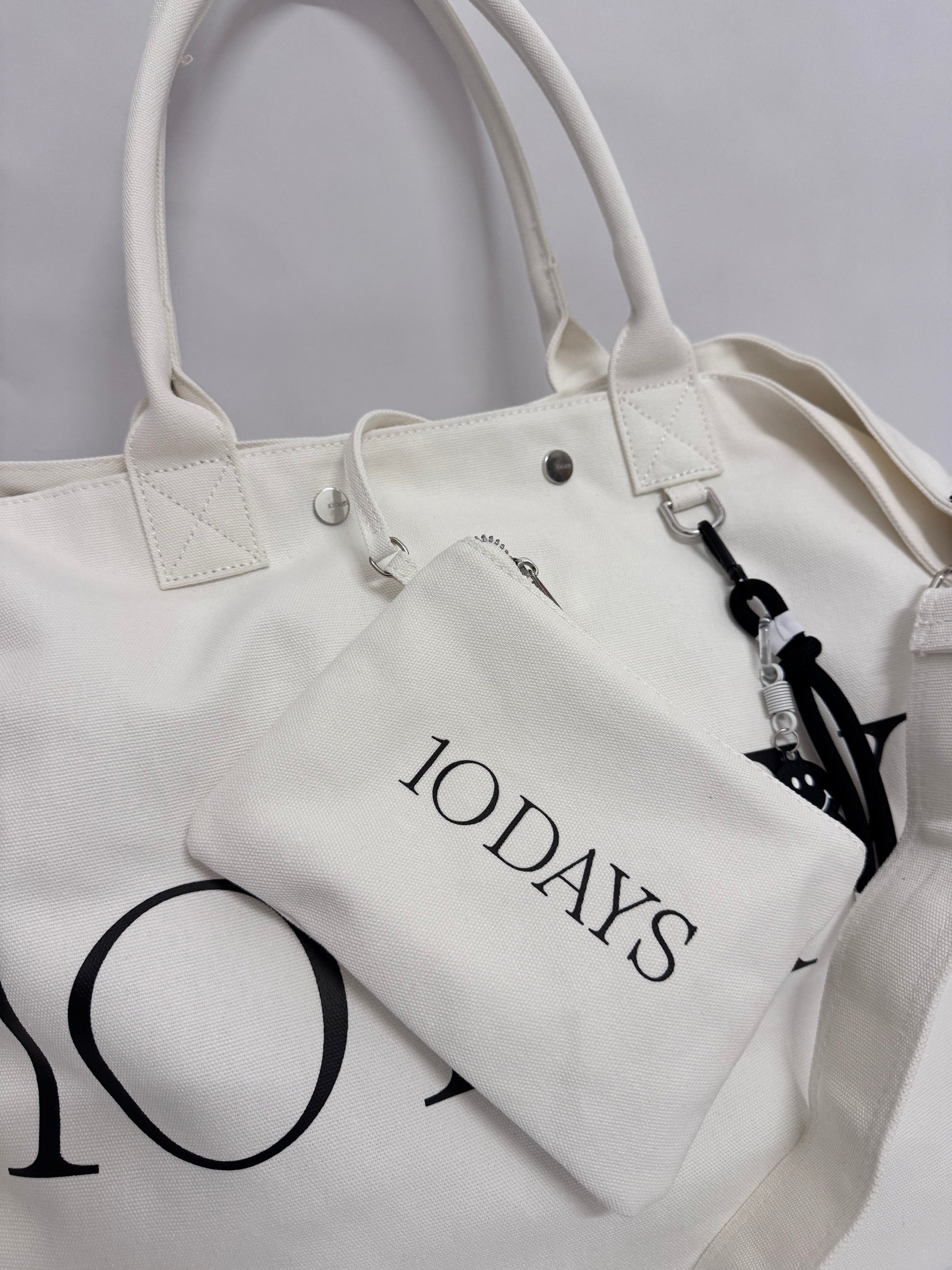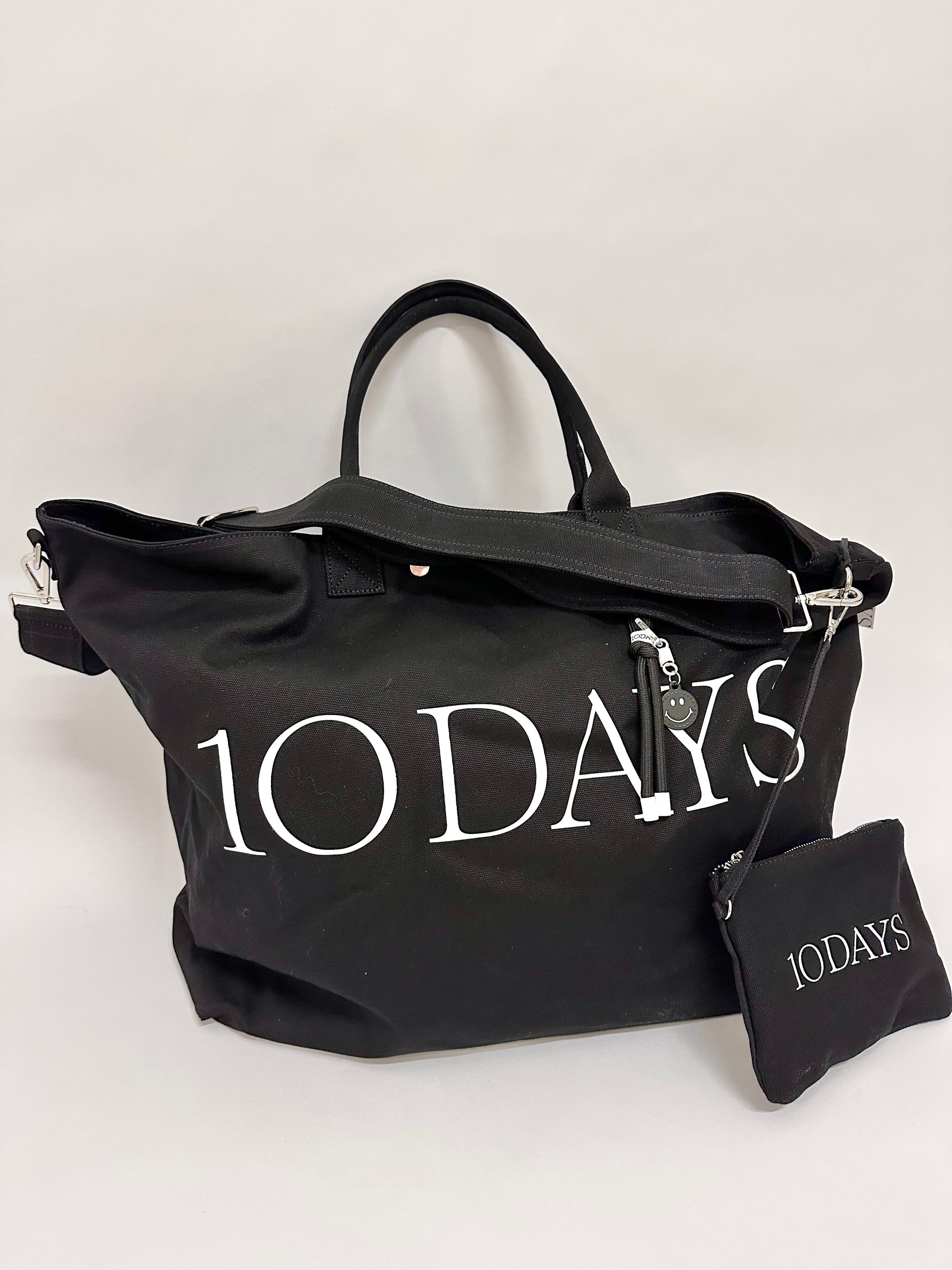 - Die Tasche ist mit einem 10DAYS-Logoprint auf der Vorderseite, Handgriffen, einem verstellbaren und abnehmbaren Schulterriemen, einem Schlüsselanhänger an der Vorderseite, einem Druckknopfverschluss und einer Innentasche mit Klettverschluss