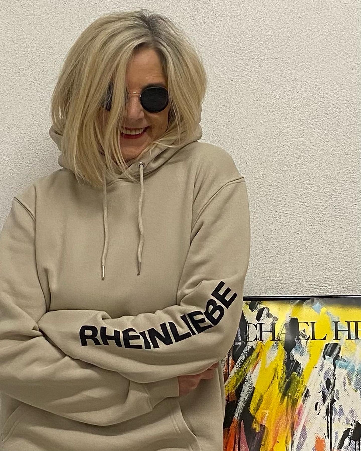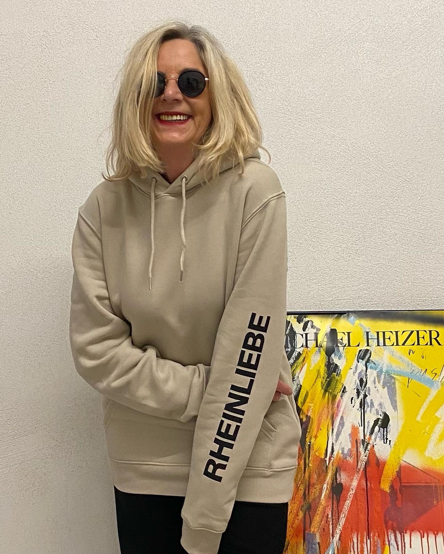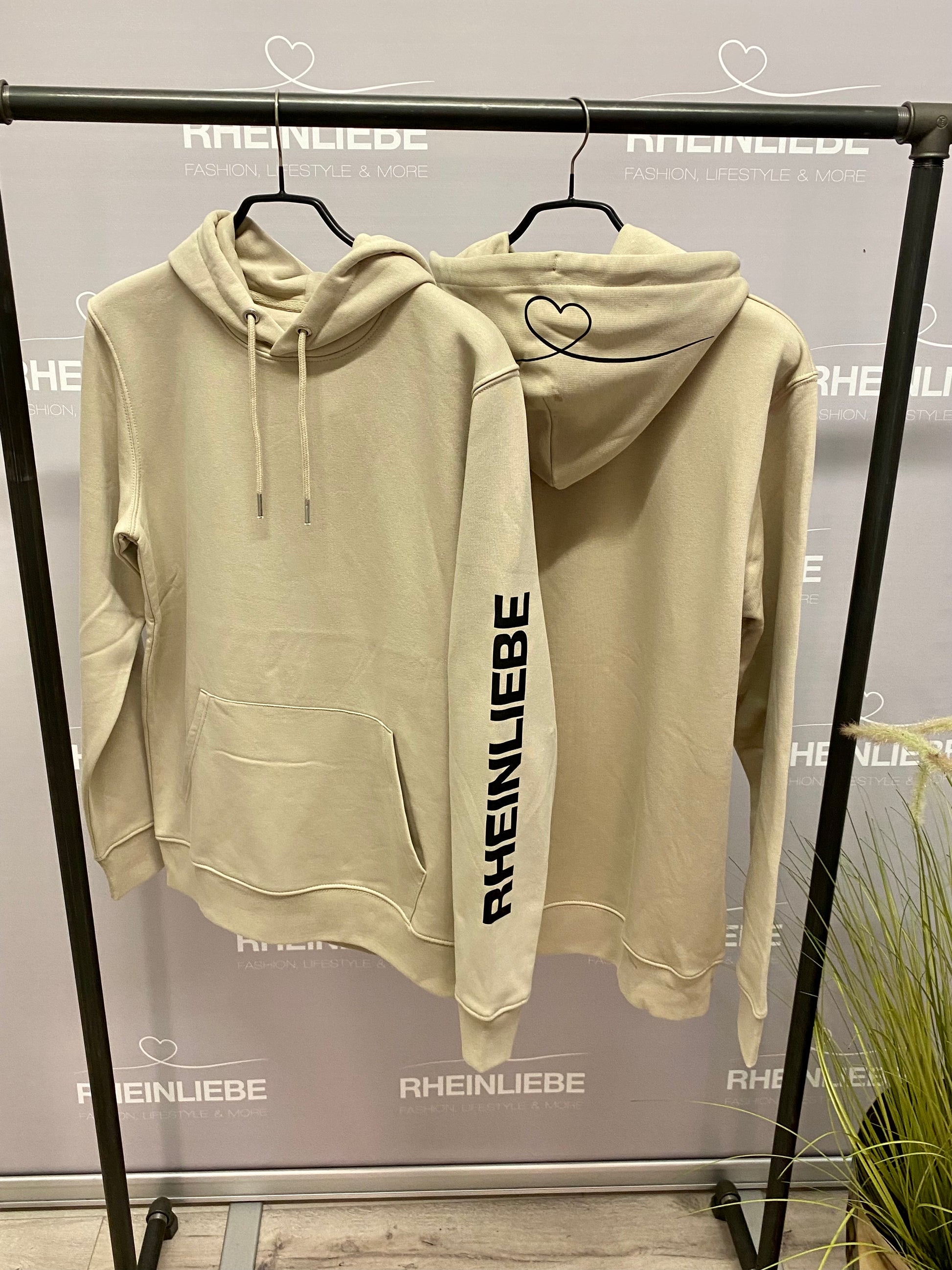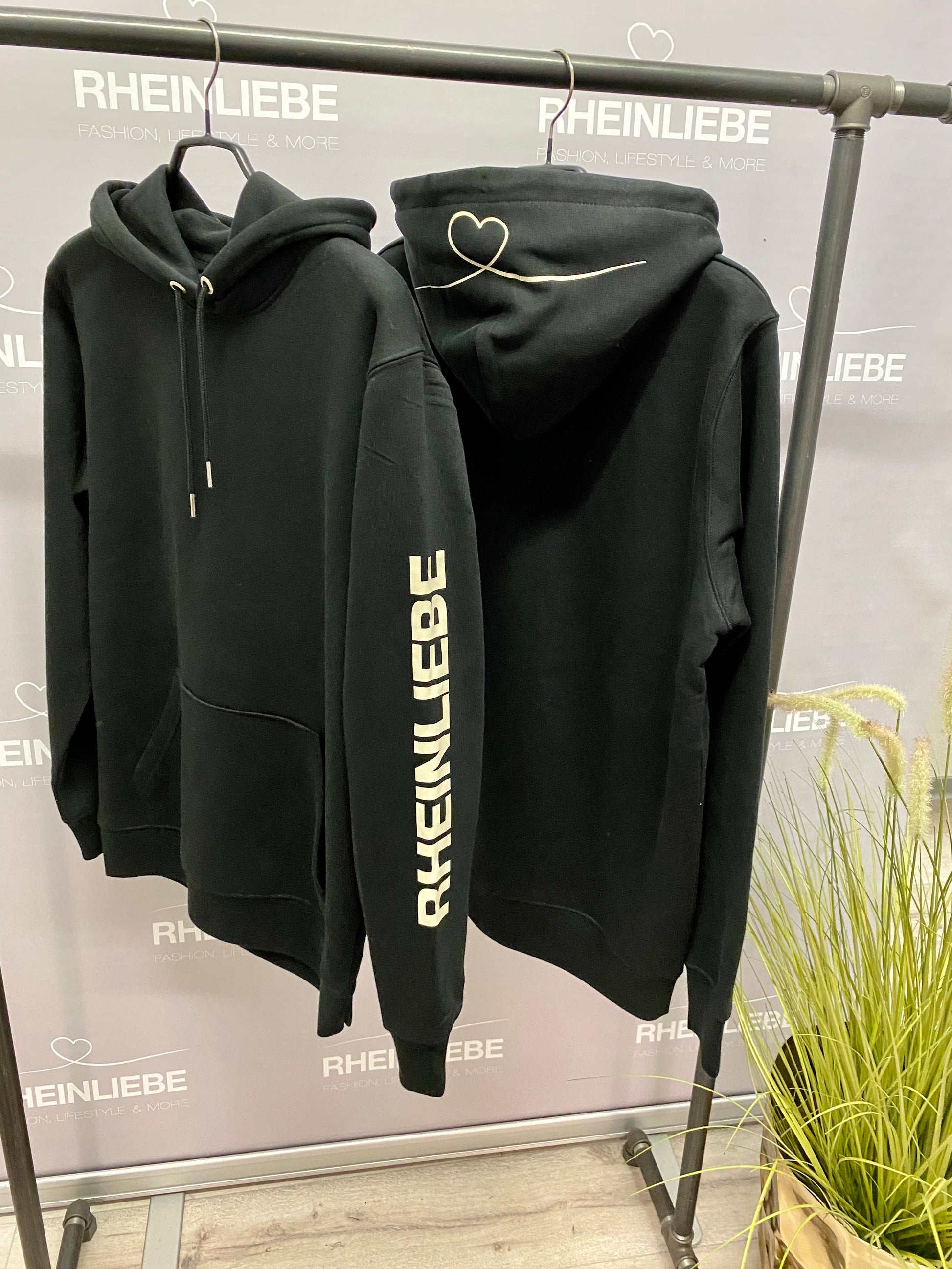 kuscheliger Hoodie mit RHEINLIEBE Aufdruck auf dem Arm, Kängurutaschen, Aufdruck auf der Kapuze.