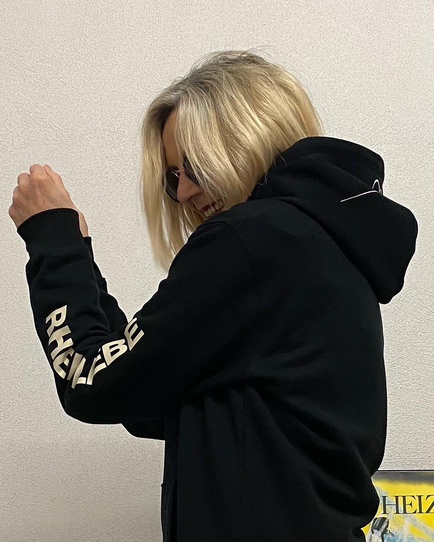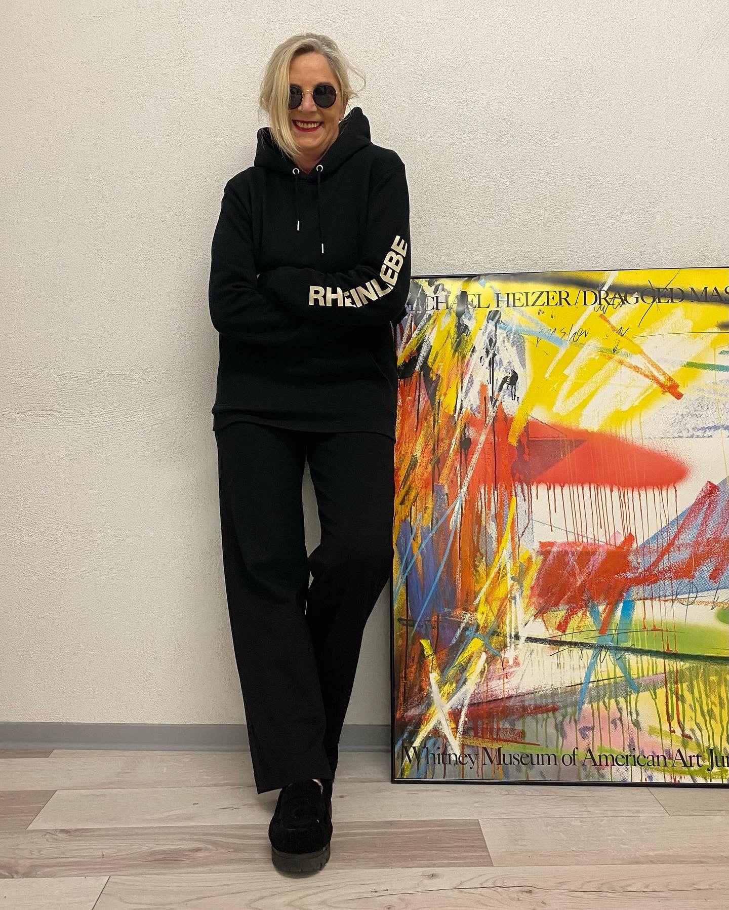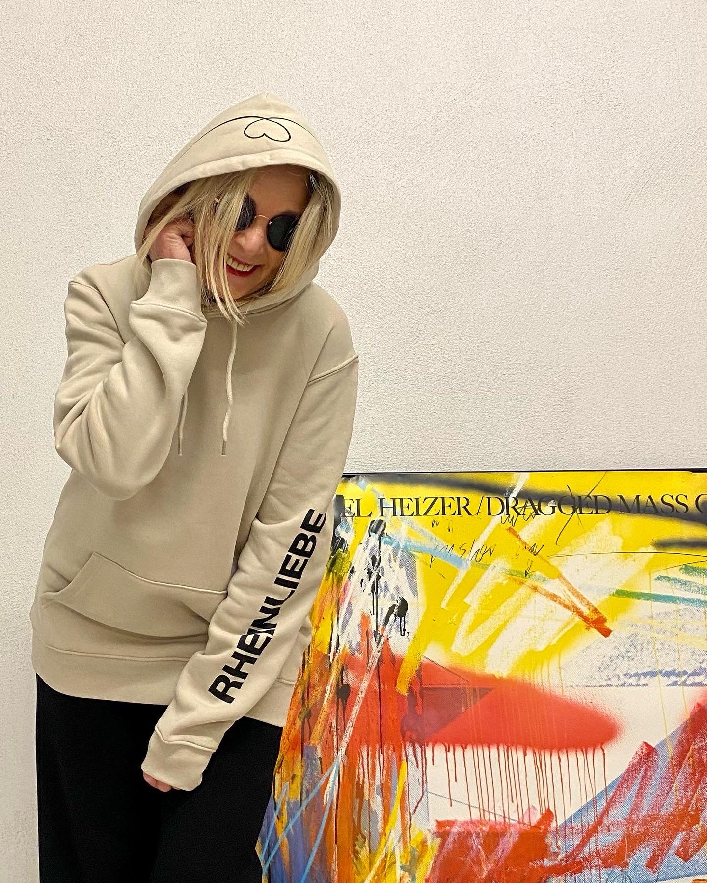 kuscheliger Hoodie mit RHEINLIEBE Aufdruck auf dem Arm, Kängurutaschen, Aufdruck auf der Kapuze.