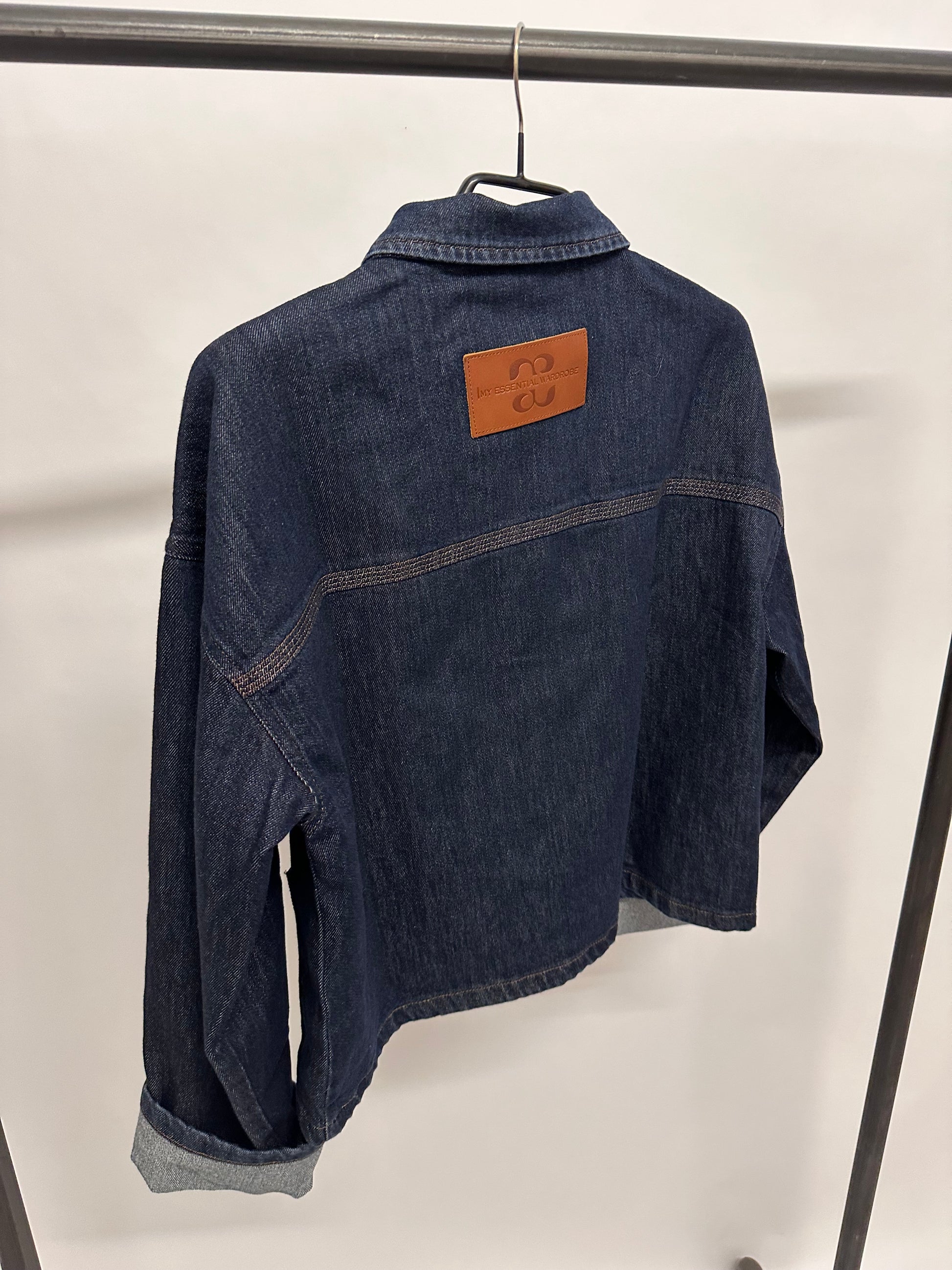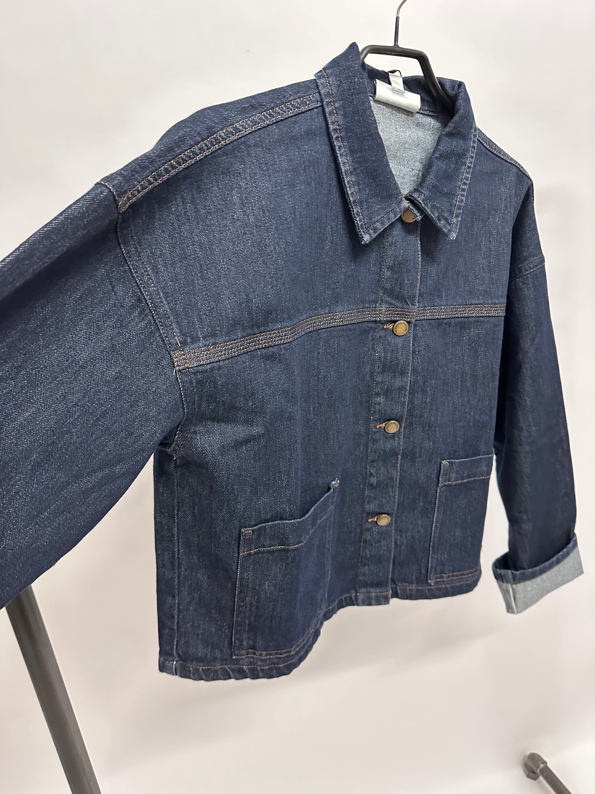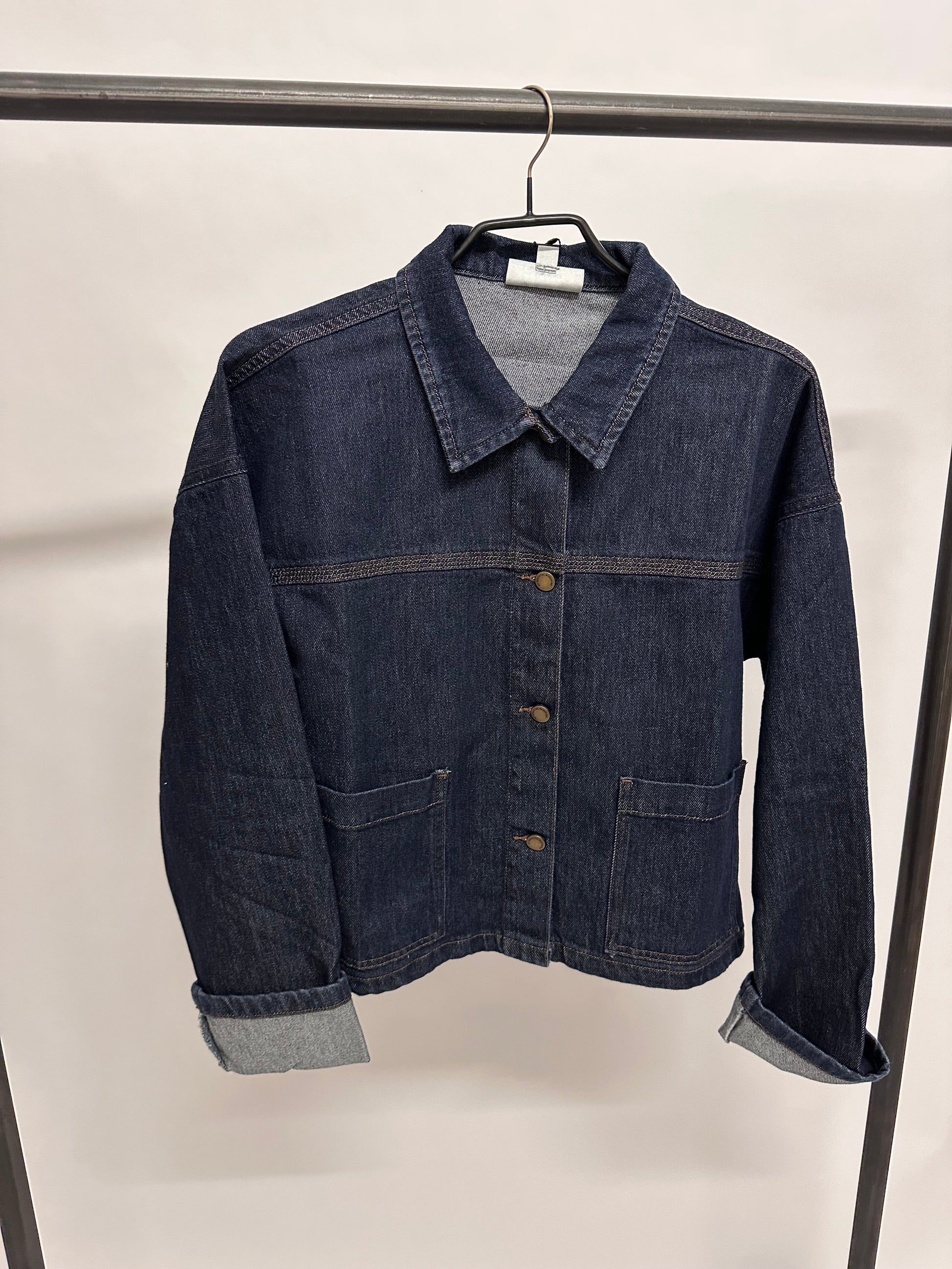 Angesagte Jeans Jacke in dark Blue un-wash Look; gerader Schnitt, ohne Bund, 2 große aufgesetzte Taschen, Kragen, Knopfleiste, Ziernähte, Leder-Logo Patch im Rücken, der aber entfernt werden kann!