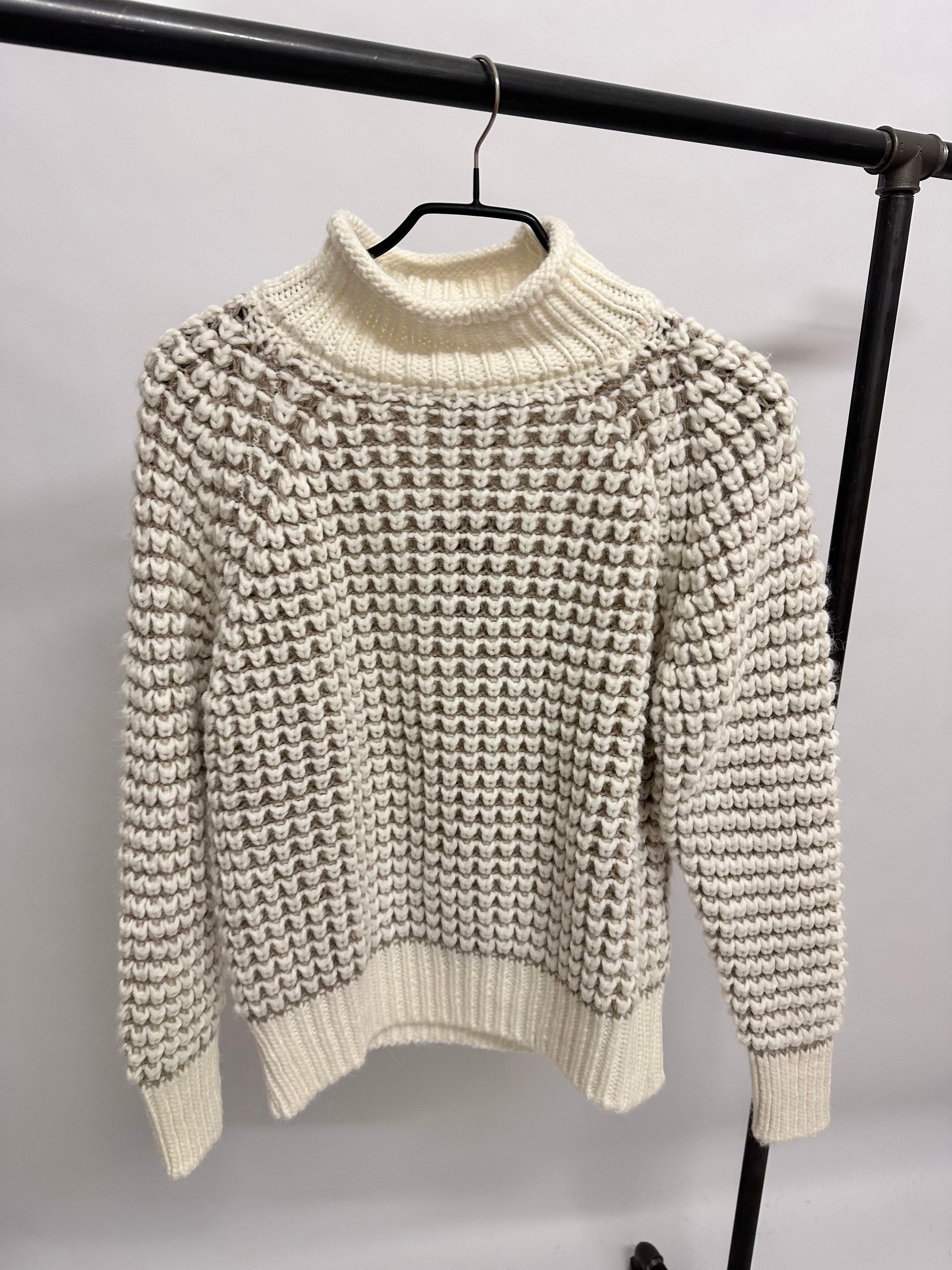 Kuscheliger Struktur Pulli mit Stehkragen und Raglanärmel, hell abgesetzte Bündchen.