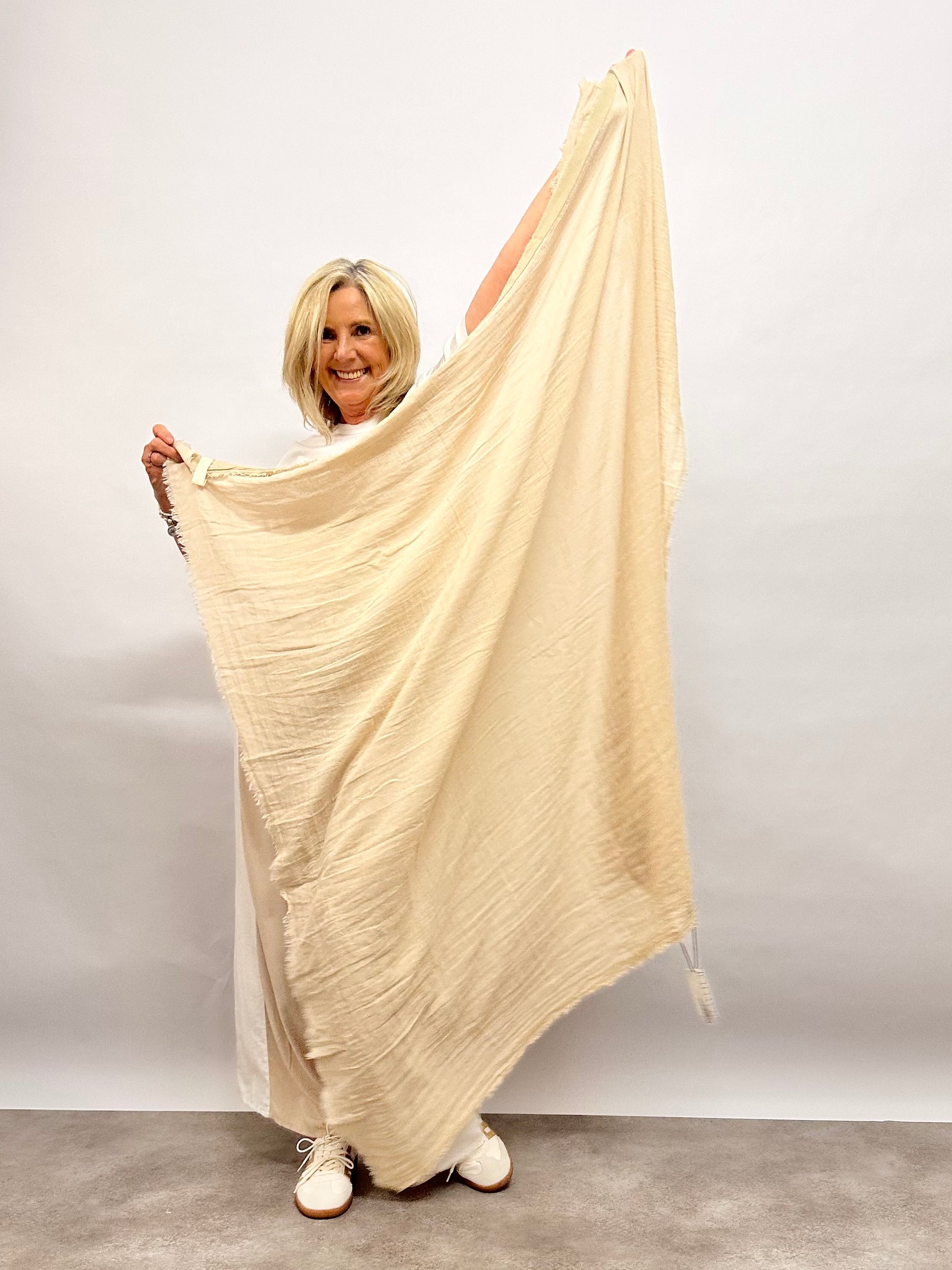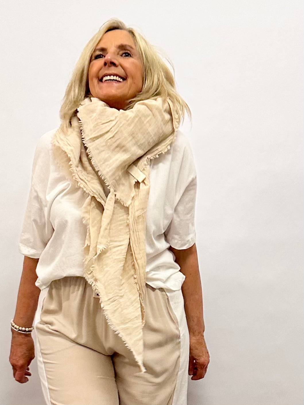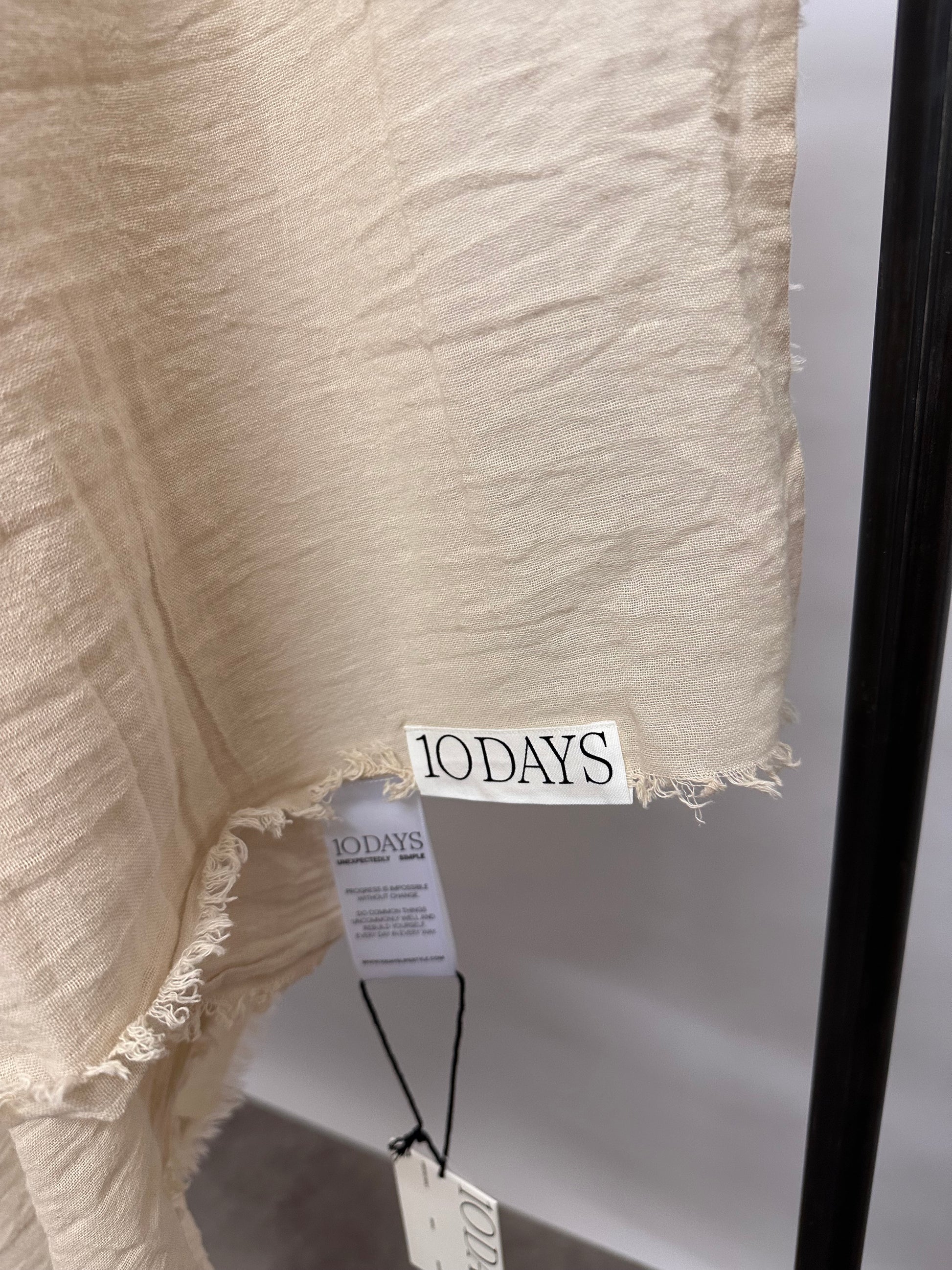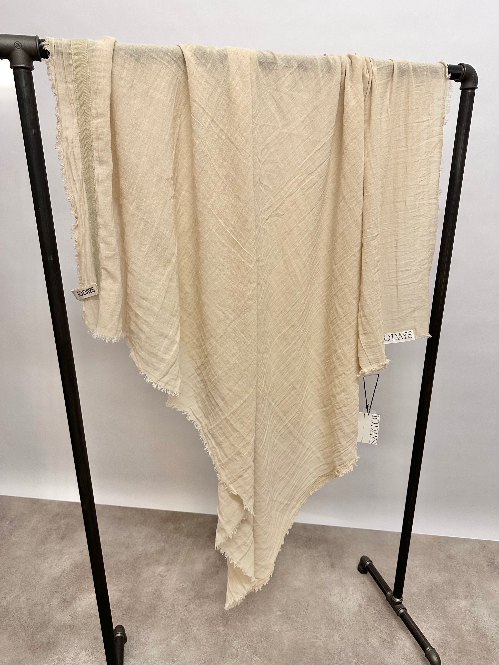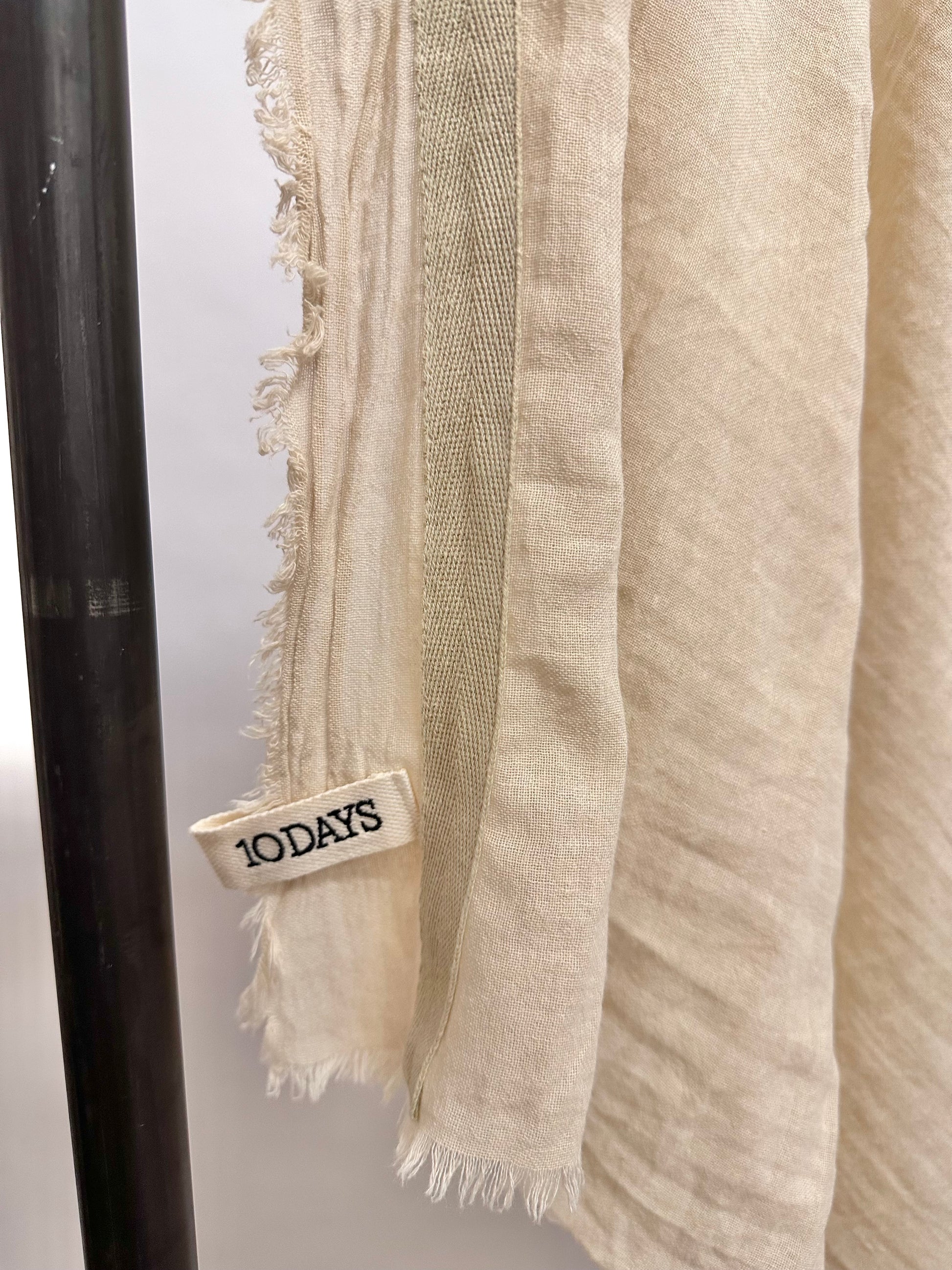 Großer Viereckiger super weicher Schal mit kleinem Fransenrand, eine Seite mit Strukturband und 10DAYS Logo.