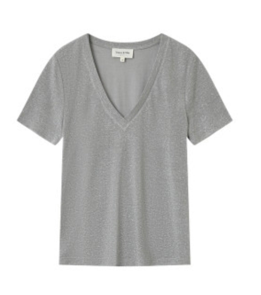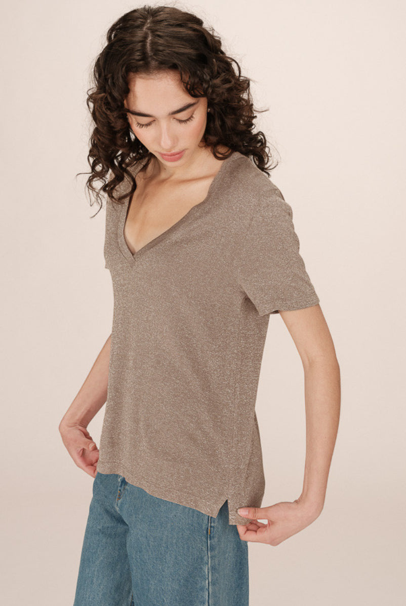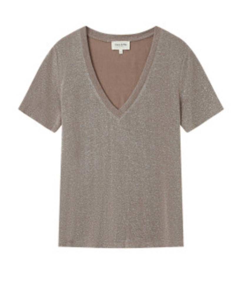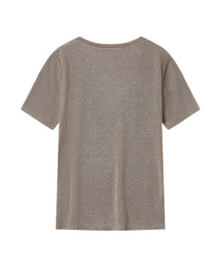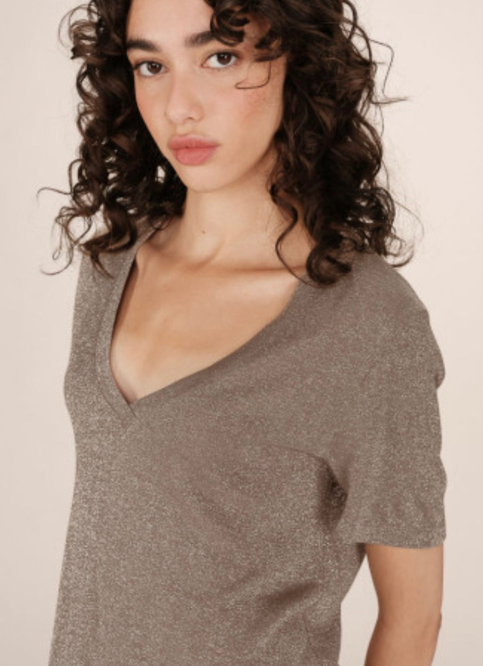Kurzarm Shirt von Grace&Mila aus Lurex, ein Basic mit dem gewissen Etwas. Leicht schimmernd! Mit V-Ausschnitt und in klassischen geraden Schnitt.