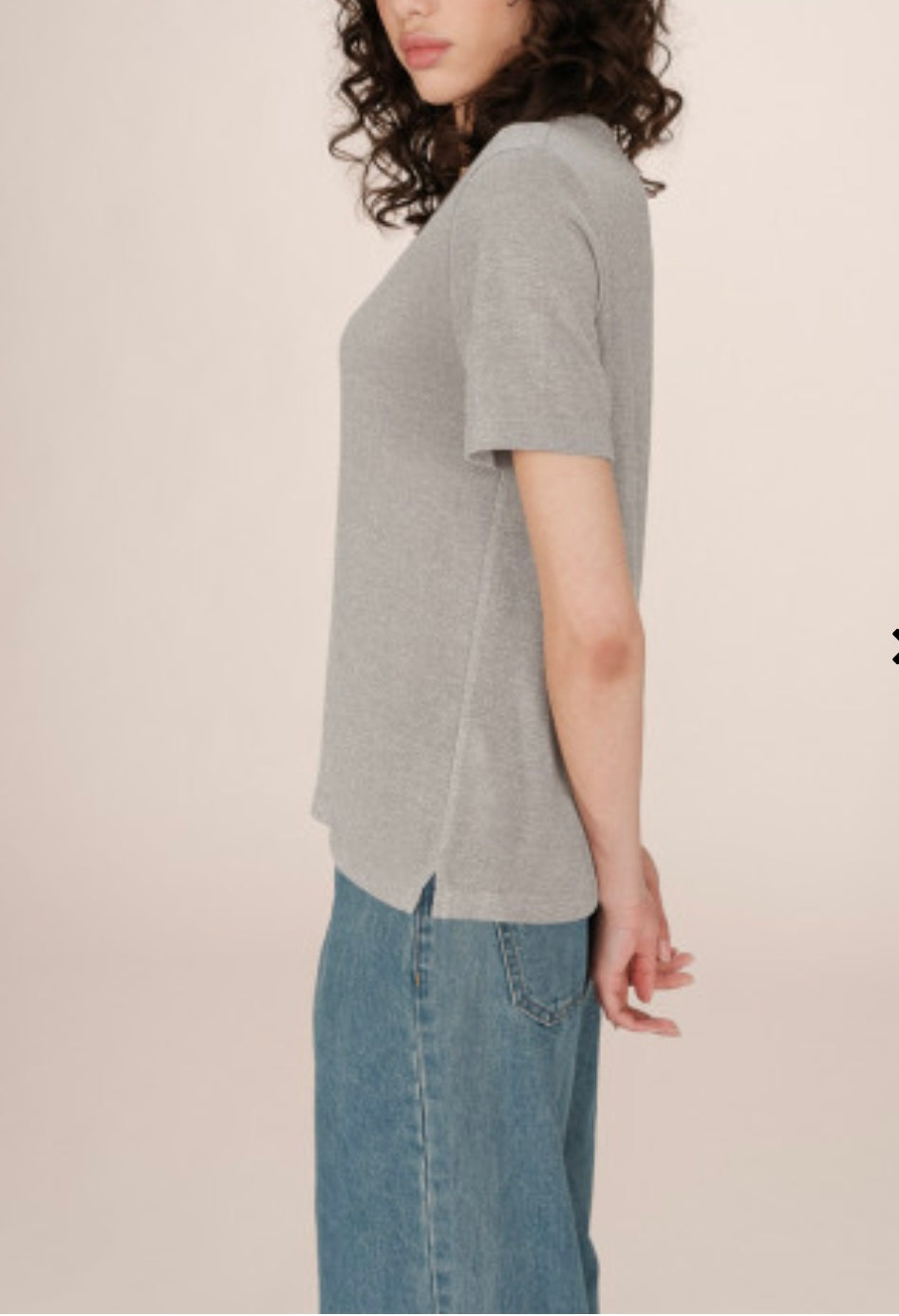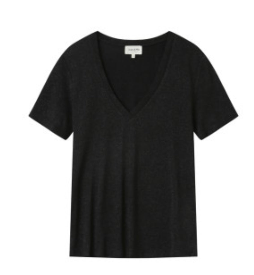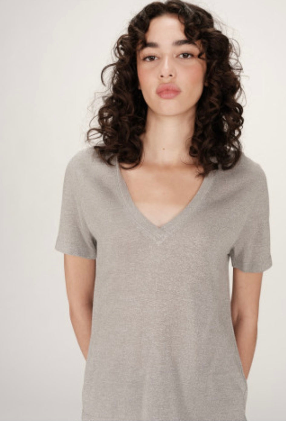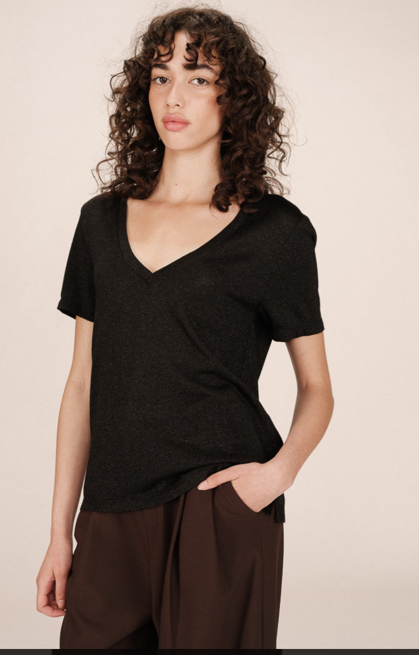 Kurzarm Shirt von Grace&Mila aus Lurex, ein Basic mit dem gewissen Etwas. Leicht schimmernd! Mit V-Ausschnitt und in klassischen geraden Schnitt.
