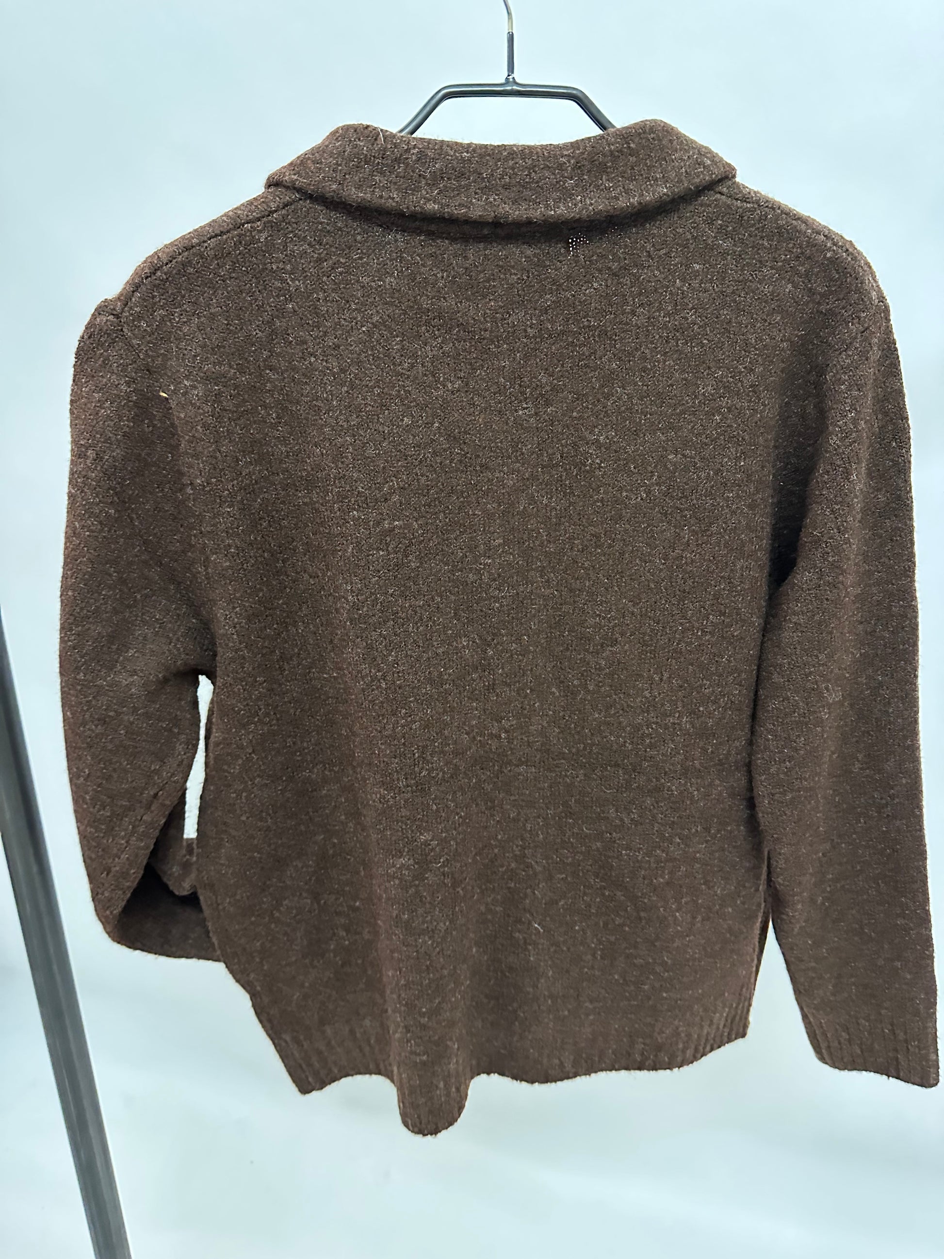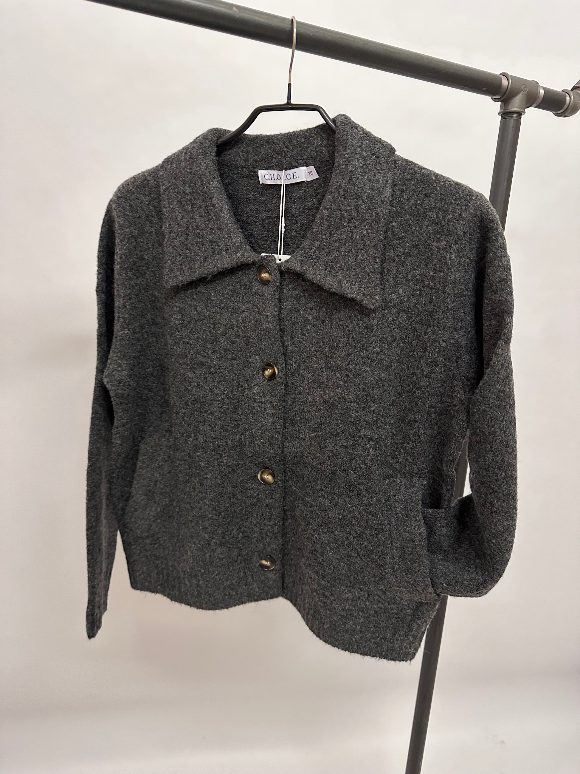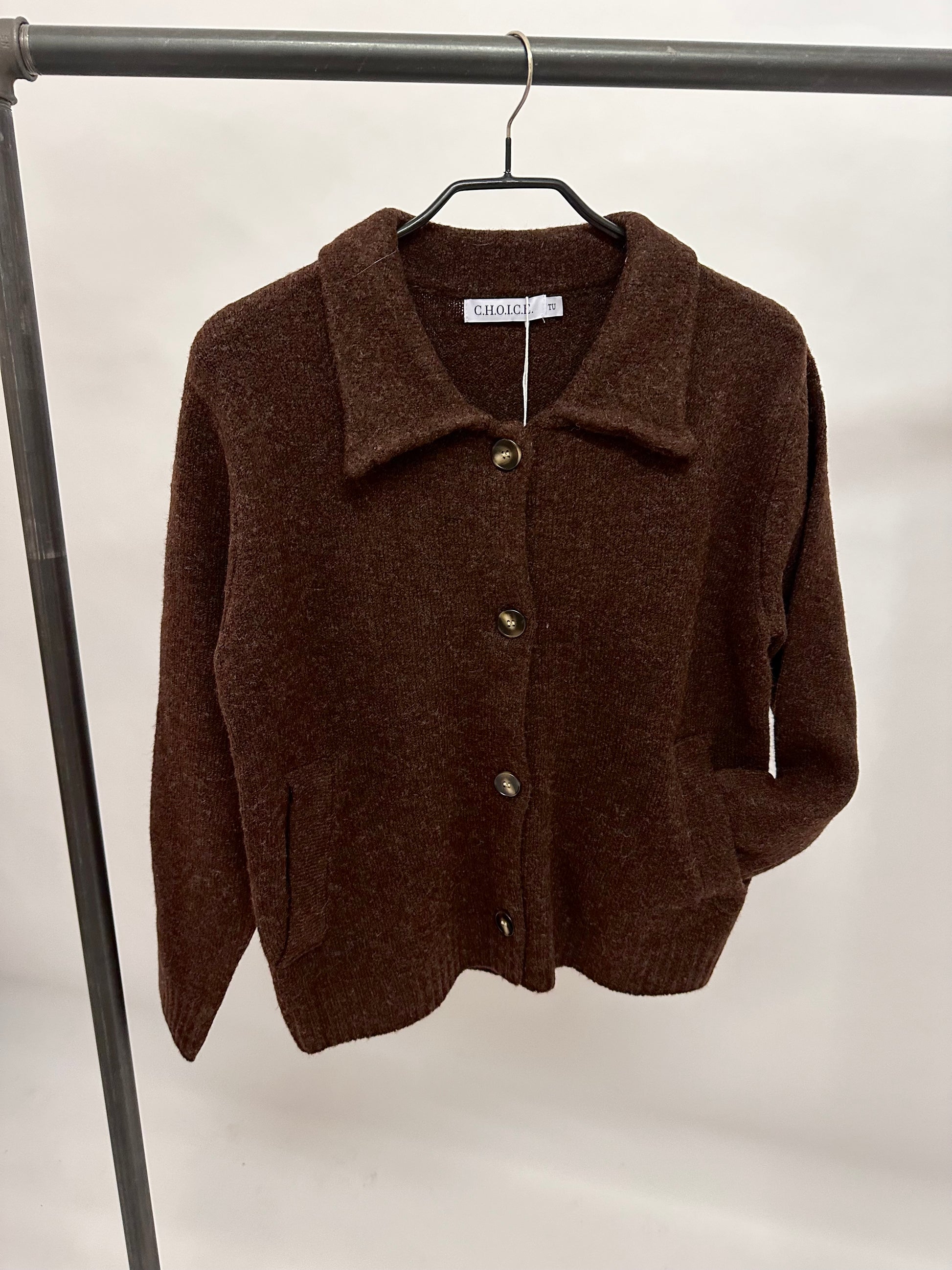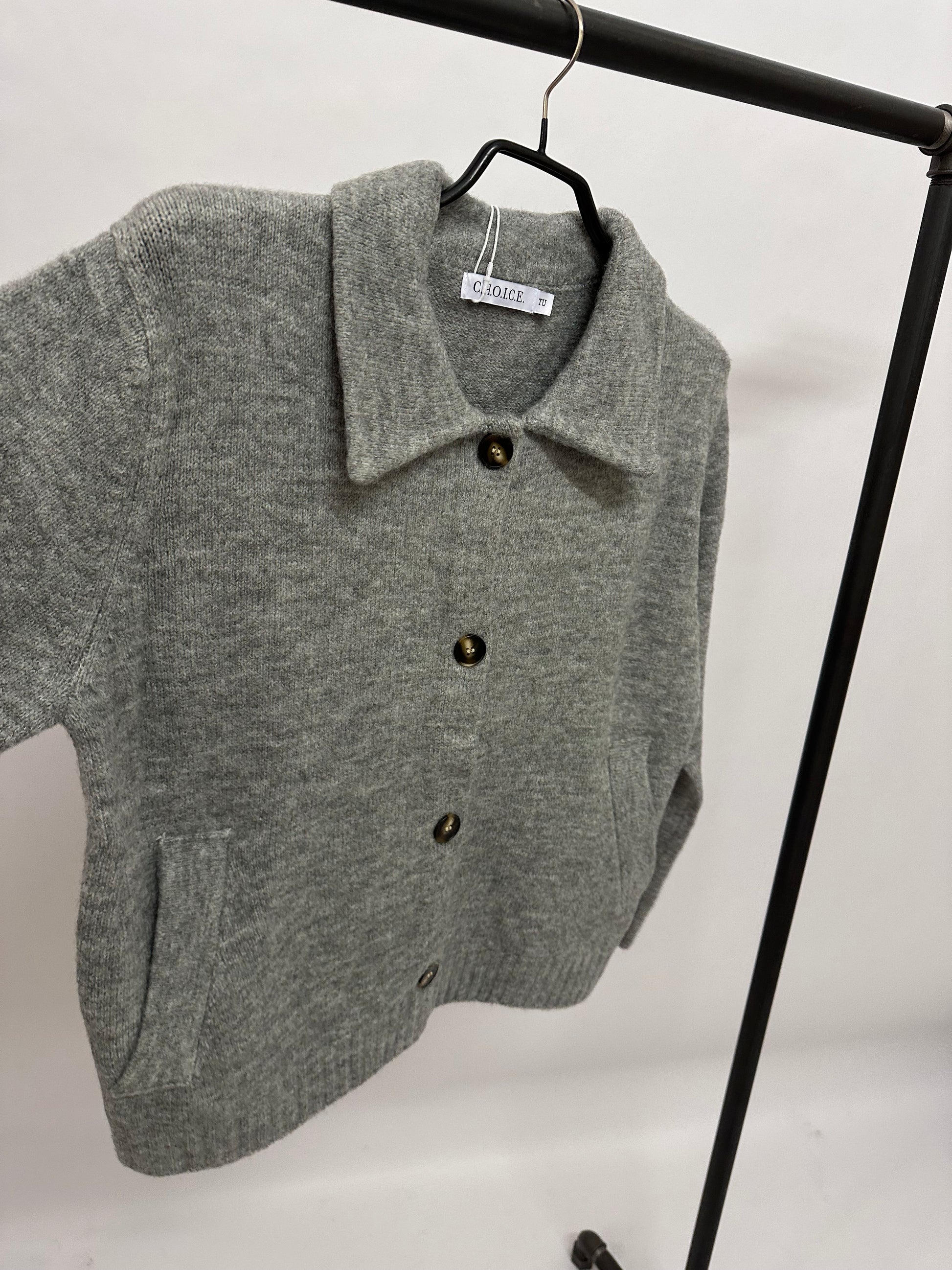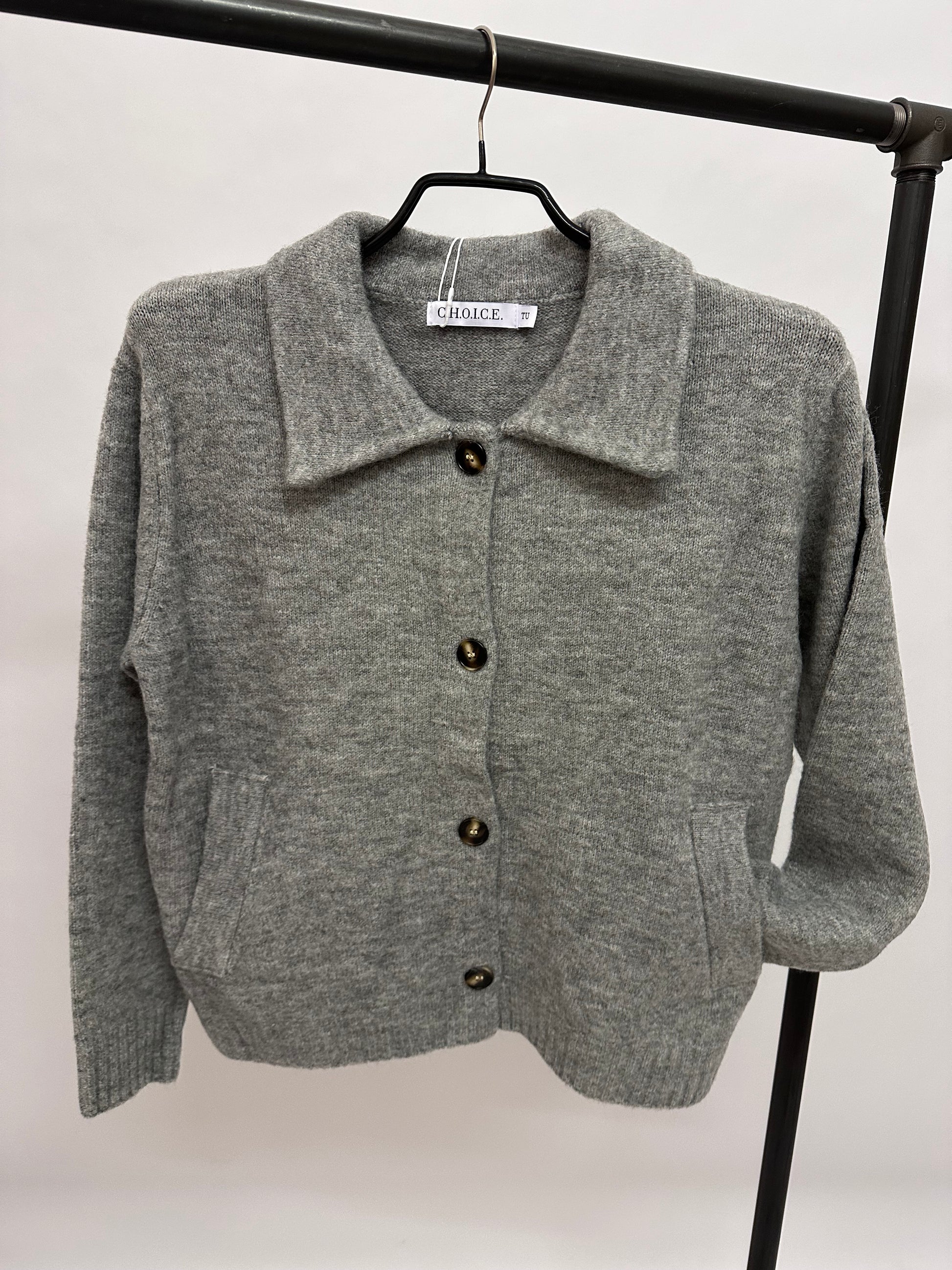 Kuschelige Strickjacke mit Kragen und Einstecktaschen, durchgeknöpft. Kann auch als Pulli getragen werden